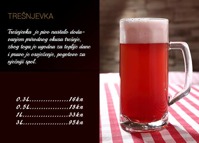 Domaći ambijent pivnice u motivu cigle i drveta upotpunjuje nacionalnu kulinarsku tradiciju, te uz kuhinju baziranu na svježim namirnicama hrvatskog podrijetla i domaće pive, stvara vrhunski doživljaj i za najzahtjevnija nepca.